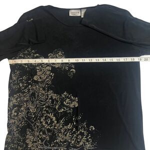 Add a touch of elegance to your wardrobe with this Chico's blouse. The black floral pattern and Gothic theme make it perfect for any occasion, whether it be casual or for work. The blouse has a round neckline and long sleeves with a casual sleeve type. It is made of a jersey fabric type, consisting of polyester and spandex materials. This blouse is a regular fit and is available in size 1. It is machine washable and has a pullover closure. The blouse is perfect for any season, whether it be winter, fall, or spring. The blouse is a basic style and has a punk, grunge, city, classic, 90s, gothic, and retro theme. This blouse is a must-have for any woman's wardrobe. Measures a 38-inch chest and is 23 inches long.