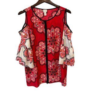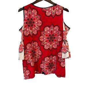 Chicos Blouse Size Medium Floral Mandala Cold Shoulder Bell Sleeve Red Black Boh