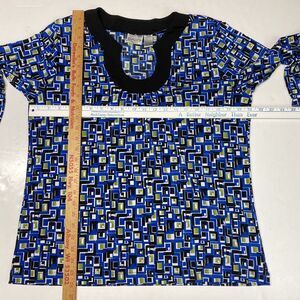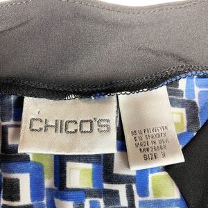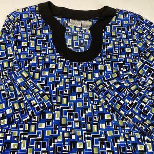 Chicos Blouse (Tag Size 3) -US 16 / XL- Womens XLarge 3/4 Bell Sleeve Retro Multicolor Blue/Black/Green Geometric Slinky Stretch Top EUC. Made In USA