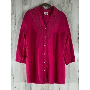 Chicos Blouse Top Size 2 or Large Pink Fuchsia 100% Linen Beaded Collar Chest