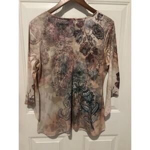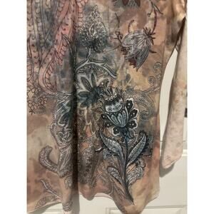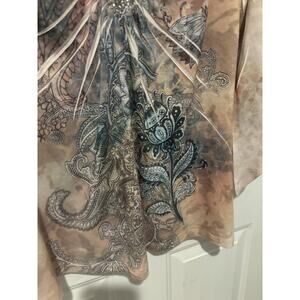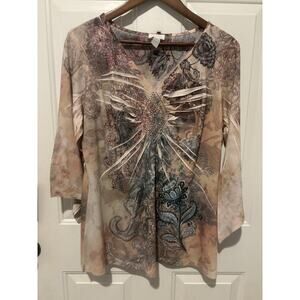 Chico’s Blouse Top Watercolor Size 2 Large Blue Pink Faux Diamond Studded 3/4