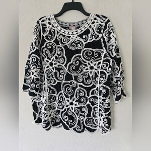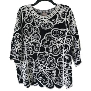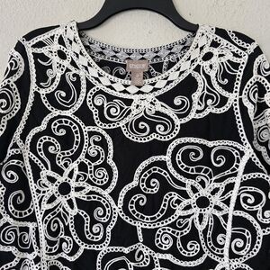 Chicos Blouse Women's Sz L Black White Geometric Print Embroidered Artsy