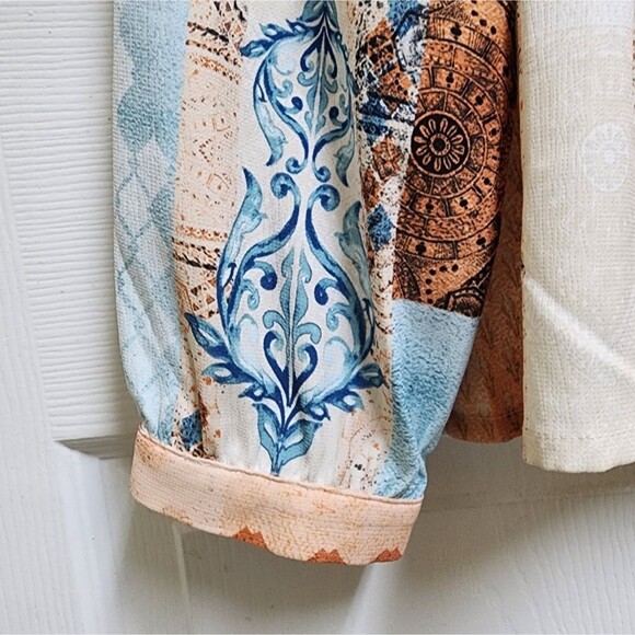 Chico's Top Womens XL Orange Blue Mixed Pattern Blouse V Neck Button Front Long Sleeve Drawstring Waist Lightweight Comfort Casual Travel Office Boho Cottagecore