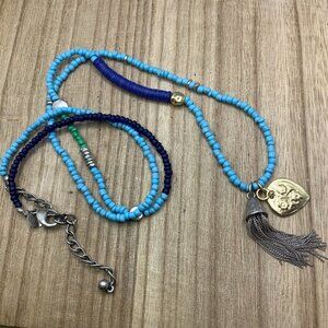 Chico's Blue Beaded Gold Heart Pendant Silver Tone Tassel Necklace