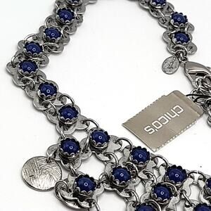 *Description: This is a beautiful Chico's blue cabochon large bib statement necklace with dangling silver tone disks and a beaded 1/2 Inch chain. It has the original tag and has never been worn. On the tag the style is Ellinora. This would be a great addition to your jewelry collection or make a great gift!