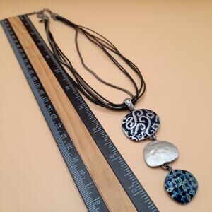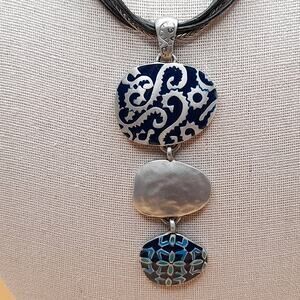 *Description: This is a Chico's pendant necklace with blue enamel designs on a silver tone background. There are leather cords and one silver tone snake chain. This would be a great addition to your jewelry collection or make a great gift!