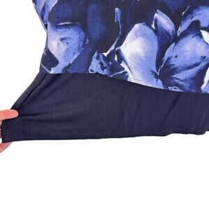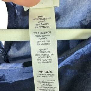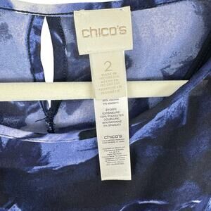 Excellent preowned condition. Chico's Blue Floral Dolman Short Sleeve Oversized Built In Tank Blouse. Tank hangs longer than chiffon shell. Shell is polyester material, tank is rayon/spandex. Approx. measurements: Shoulder to hem 29", pit to pit 22". Size 2 (L).
