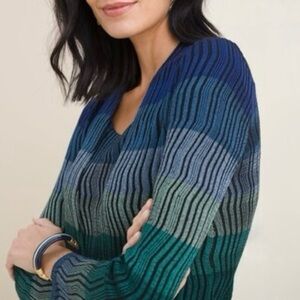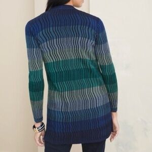 Chico’s striped open front cardigan in shades of blue and green. Lightweight knit with an art-to-wear look and flattering drape. Long sleeves, versatile layering piece, and perfect for casual or workwear.