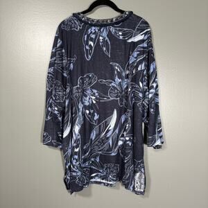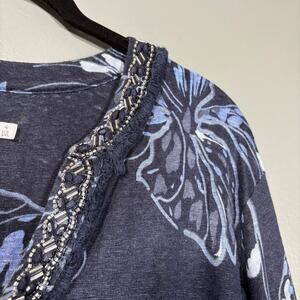 Women's plus size linen boho beaded tunic length top by Chicos. This navy blue floral top has a v-neck with beaded and fringe detail, a long length, and long sleeves. It is 100% linen.