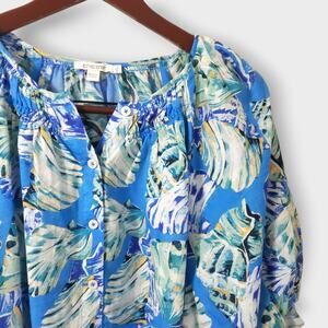 Chico's Blue Seashell Ramie Puff Sleeve Button Up Blouse Sz 3 (16) Coastal