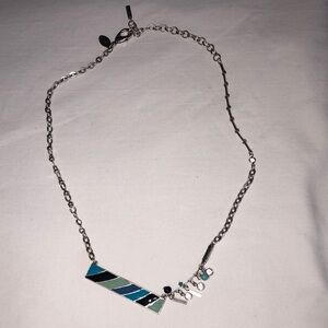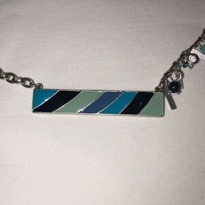 Chicos rectangular or painted bar necklace. Enameled with blue green black with little charm accents. Very good pre-loved condition. See measurements in photos.