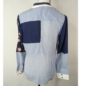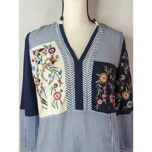 Chico's Blue Striped & Floral Patchwork Embroidery Top Soft Cotton