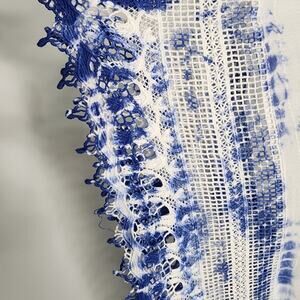 White and blue lace trim poncho from Chico's. Semi sheer. Crochet lace trim. Side seams for subtle shape. No fabric tag