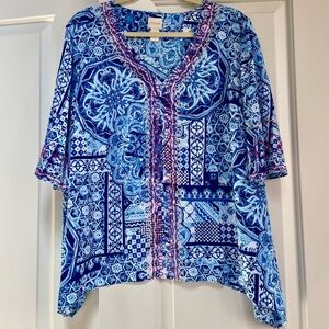 Chicos Blue White Embroidered Boho Lightweight Hi Lo Hem Coverup Top Shirt