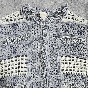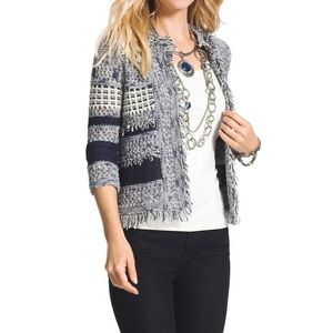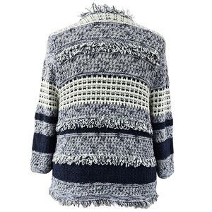 Chico's Blue White Fringe Detail Textured Cardigan Open Front Stripe Beachy Boho