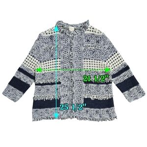 Size Chico's 3 which is size 16. Good used condition, with no stains or tears. A blue and white stripe open front cardigan. Open knit, with fringe trim. 3/4 sleeves. Has loose threading shown in the last photo.