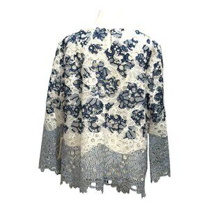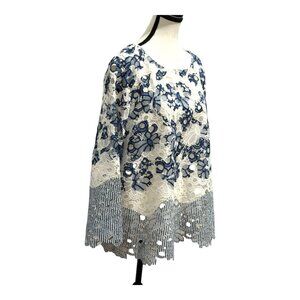 Brand new with tags Chico’s Popover Lace Top in a stunning blue and white floral embroidered design. This eye-catching blouse combines elegance and comfort with its intricate lace overlay and lightweight woven lining. Perfect for brunch, travel, or special occasions.