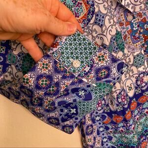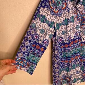 Chico’s Blue White No Iron Button Up Tunic 0. Equal to size 4. Brand new w tags. Three quarter sleeves, long tunic style w button up. Beautiful blue, white and red designs all over. Approx Measurements in photos.