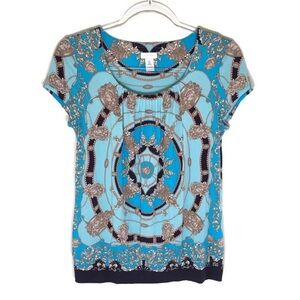 Chico's Blue and Gold Scarf Print Short Sleeve Top Blouse Small