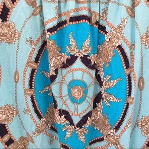 Blues, with coral and a tan gold in scarf print pattern