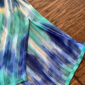 Beautiful airy Chico's top. Size 1. Featuring a vibrant blue and green pattern, this top is perfect for Spring. Sheer top with turquoise beaded vneck. Split on both sides. Stunning with white pants. Silver metallic running throughout. A few minor imperfections- last picture shows a “run” but not noticeable on. Price reflects!