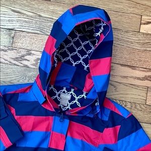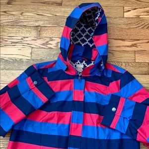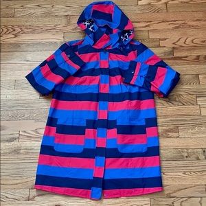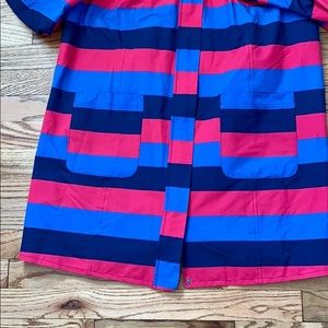 Vibrant trench coat with bold blue and pink stripes. Stylish and eye-catching design. Perfect for adding color to any outfit. This has been worn. EUC.