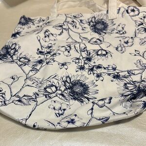 This stylish tote from Chico's showcases a striking blue floral and animal print on a white background, offering a unique artistic flair. With its spacious design and natural-colored handles, it combines practicality with elegance, making it perfect for everyday use.