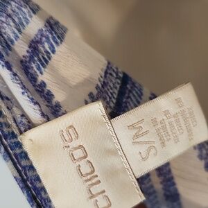 Embrace the beach vibe with Chico's chic swim coverup, featuring a captivating blue and white chevron pattern. This lightweight, flowing design with a V-neckline and kimono-style sleeves is perfect for poolside relaxation. The ombré effect adds a touch of elegance, transitioning from soft hues to a rich royal blue at the hem.