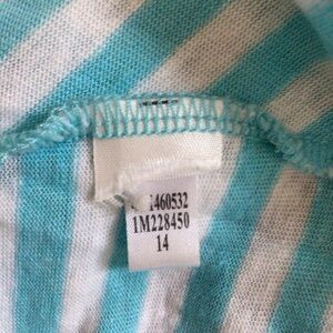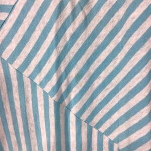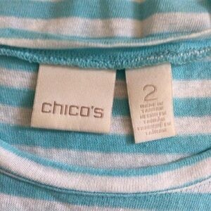 Chico’s blue and white striped short sleeve top. Chico’s size 2. This top has a drawstring waist. Pre-owned condition. No rips or holes. There is a very light stain on the front as shown in the second photo. It’s so light that I couldn’t get it to show up in the photos but I wanted to point it out anyway. The material/care tag is missing. Smoke free home.
