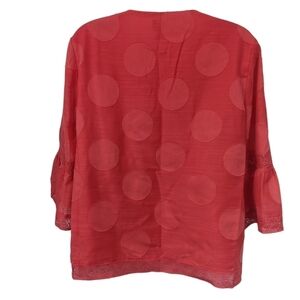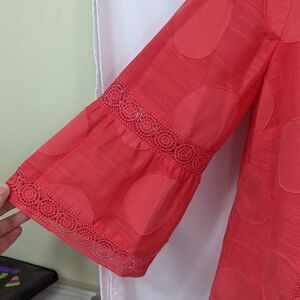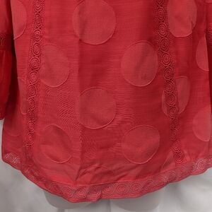 This shirt is in gently used condition. It has woven circles throughout. Also has crochet detailing. The sleeves are belled and 3/4 length. It is fully lined. Please see photos for details.