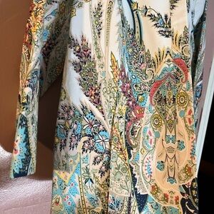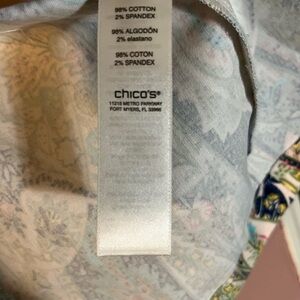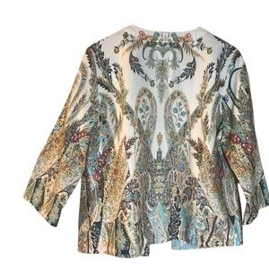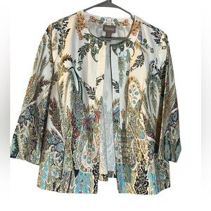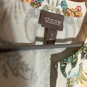 Chicos Jacket Sz 1 Women career artsy eccentric work Medium White Floral Open Front Stretch 3/4 sleeve blazer Topper Jacket excellent pre owned condition. Has seams down front and pockets.