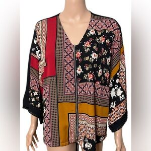 Boho blouse, kimono top, Chico’s size 1, patchwork floral top, fringe cuff blouse, zip front blouse, festival fashion, casual chic top, multicolor kimono shirt