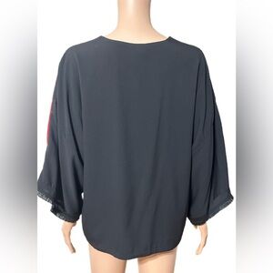 • Sleeve: Wide 3/4 sleeves with black fringe trim