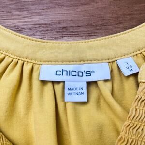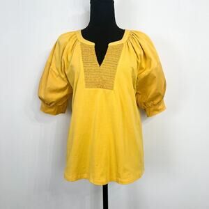 Chico’s Boho Puff Smocked Short Sleeves Blouse Sz 1 US M Mustard V Neck Shirt