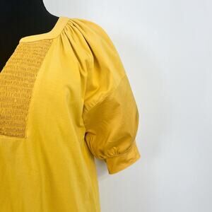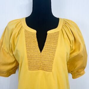 Chico’s Boho Puff Smocked Short Sleeves Blouse in Mustard Yellow Color; V Neck ; Relaxed Boxy Fit; Easy to wear and care