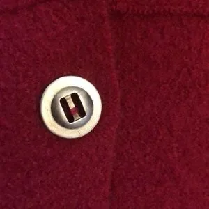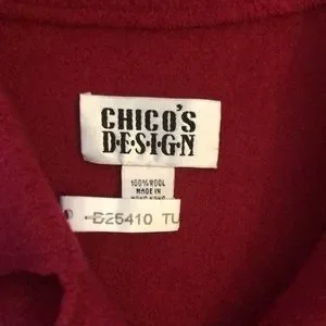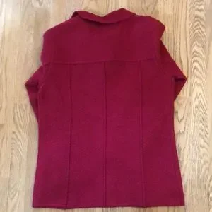Chicos boiled wool cardigan in lush raspberry color! This is 100 percent wool, made in Hong Kong. Size says 0, but 19 pit-to-pit. There is no stretch to speak of, but the wool is very soft, boiled wool style. Color best seen in the second pic.