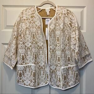Chicos Bonded Lace Henrietta Cardigan Jacket Faux Leather Tan White Size 2 Large