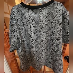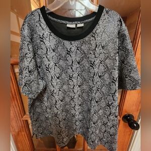 Embrace a bold style with this Chico's tee, showcasing a captivating black and gray reptile scale pattern. The short sleeves and boxy, relaxed fit offer both comfort and a modern edge, perfect for any casual occasion.