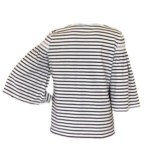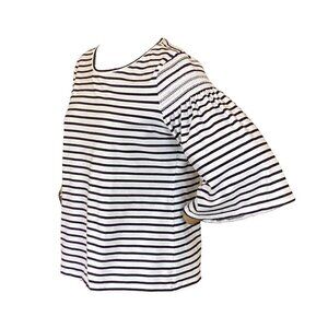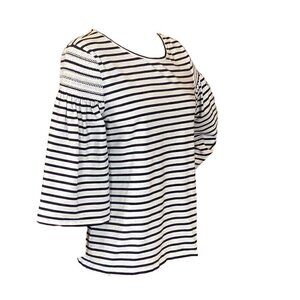 Description: Chico's Breton Stripe Stretch Knit Top with Smocked Shoulder Accent and 3/4 Bell-Flared Sleeves and round neckline, Cotton, Spandex, Machine Washable.
