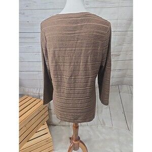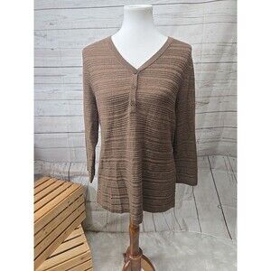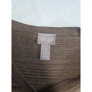 Chico's women's size 1 or medium brown 3/4 sleeves v neckline with 3 working buttons. Nylon, rayon, polyester, and cashmere blend.