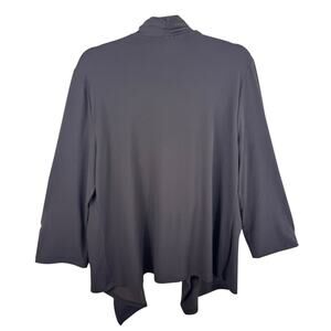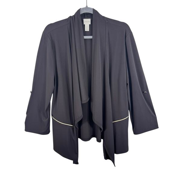 Excellent preowned condition. Chico's Brown Long Roll Tab Sleeve Stretchy Draped Open Blouse. Zippered pockets on lower front. Polyester/spandex material. Approx. measurements: Shoulder to hem 27", pit to pit 23", sleeve from neck to sleeve hem 26". Size 2 (L).