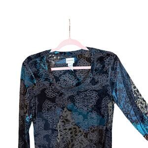 Chico’s Burnout Velvet Floral Top Size 1 M Teal Black Long Sleeve phoebe buffet