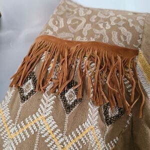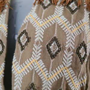 Chicos Buttered Rum Diamond Artisan Beaded Boho Fringed Linen Blend Jacket sz S