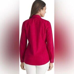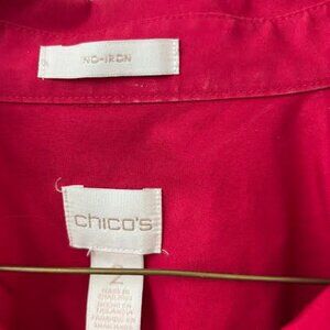 Chico's Women Button down shirt - EUC - Size 2 - Long Sleeve Red - Casual no iron shirt - Spread notch Collar and Button Cuff details. Flattering front darts for a tailored look. 100% Cotton. Comes from a pet free and Smoke free home