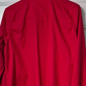 If you like red this top will be a fav. It buttons on the front with the top 3 buttons showing. The remaining buttons are covered. It has long sleeves with a single button cuff. It has a shirt tail hem that is split on sides. It measures pit 2 pit 21" and is 31" long. Sleeves are 23 1/2 " long. Top is long enough for wearing leggings but will also work with jeans or slacks. It is a no iron 100% cotton and is machine washable. LNWOT.