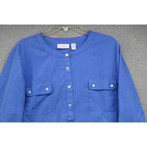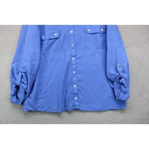 This is a Chico's Blue Button Up Roll Tabbed Sleeves Blouse that is a size 3 or XL. It is 75% Modal and 25% Polyester. Laying flat, It measures: Armpit to armpit-24.25" and the length is 26". It is very soft and in great condition.