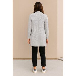 This cardigan sweater combines classic cable stitching with a cozy, open-front design. Its frosted gray hue offers understated elegance, while its blend of soft materials ensures warmth and comfort during cooler weather. Thoughtfully crafted with ribbed detailing and a mid-thigh length, it enhances any wardrobe with sophisticated layering versatility.