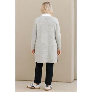 This cardigan sweater combines classic cable stitching with a cozy, open-front design. Its frosted gray hue offers understated elegance, while its blend of soft materials ensures warmth and comfort during cooler weather. Thoughtfully crafted with ribbed detailing and a mid-thigh length, it enhances any wardrobe with sophisticated layering versatility.