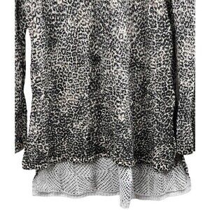 Clean, neat, no fading. Missing material tag (cotton blend with stretch) Long Sleeves Boat Neck High Low Animal Print White, Black, Brown Interior White Nape to hem 32" Chest measured flat across front pit to pit 24"