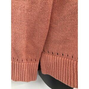 A women's knit cardigan jacket from Chico's. The jacket is in an orange salmon color, button down front, long sleeves, v-neckline, and the top is new without tags.